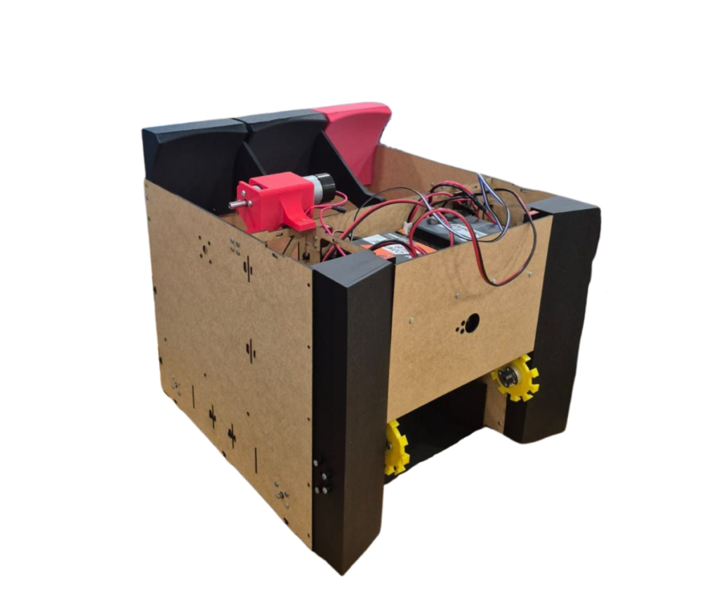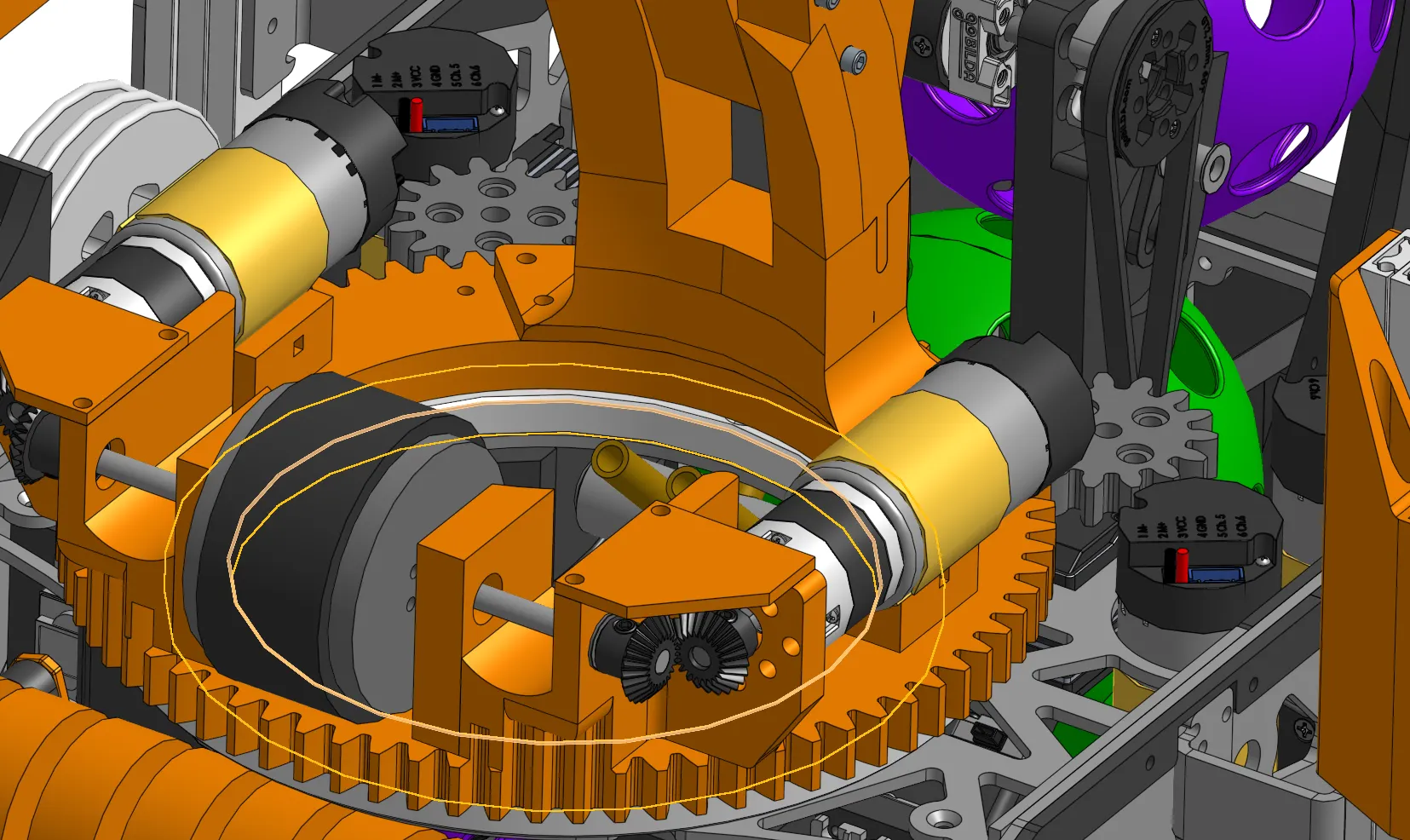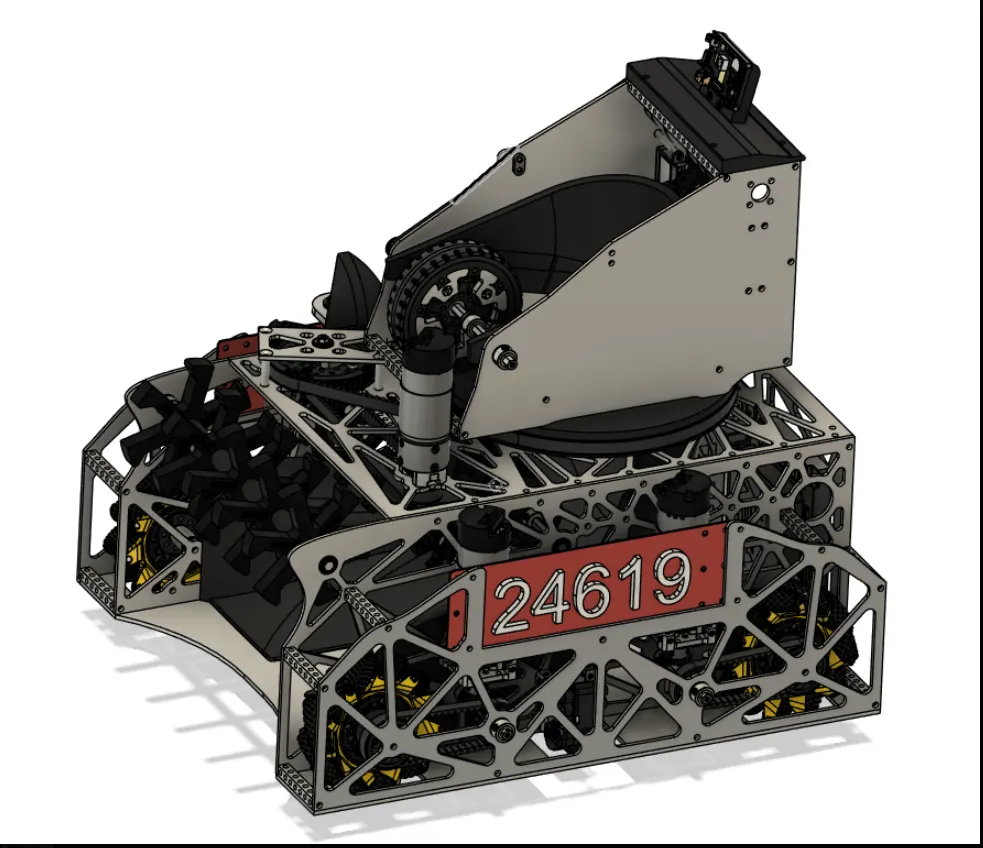 Enquanto ocorriam os testes do robô, a equipe tomou uma decisão estratégica em voltar para o robô utilizado no Regional — com base numa análise dos prazos que tinhamos em comparação com as funções que queríamos para o robô — mas incluindo melhorias significativas, como a troca dos motores da REV-Robotics3, que possuem um RPM4 que não atendia as necessidades do mecanismo do shooter5, pelos motores GoBilda6; outro exemplo de melhoria é a utilização dos leds que auxiliam os drivers7 durante a partida a visualizar os status robô.